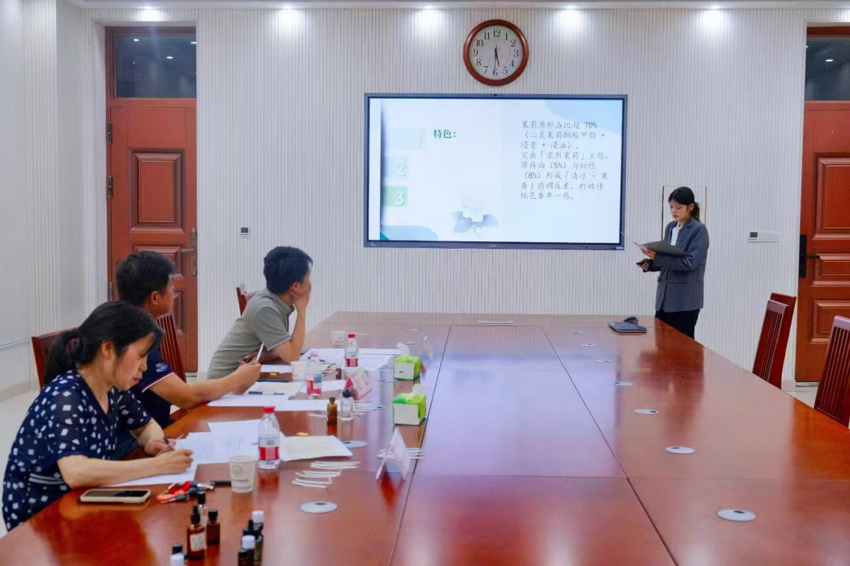 “花香淡了点,再加5mL芳樟醇吧。”“快来闻闻我们的!”“哎!你们的创意是什么?”“苯甲酸甲酯加多了!味道有点刺鼻!”……此起彼伏的讨论声中,调香不再是书本里的黑白文字,也不再是老师口中遥不可及的概念,而是我们触手可及的当下。
