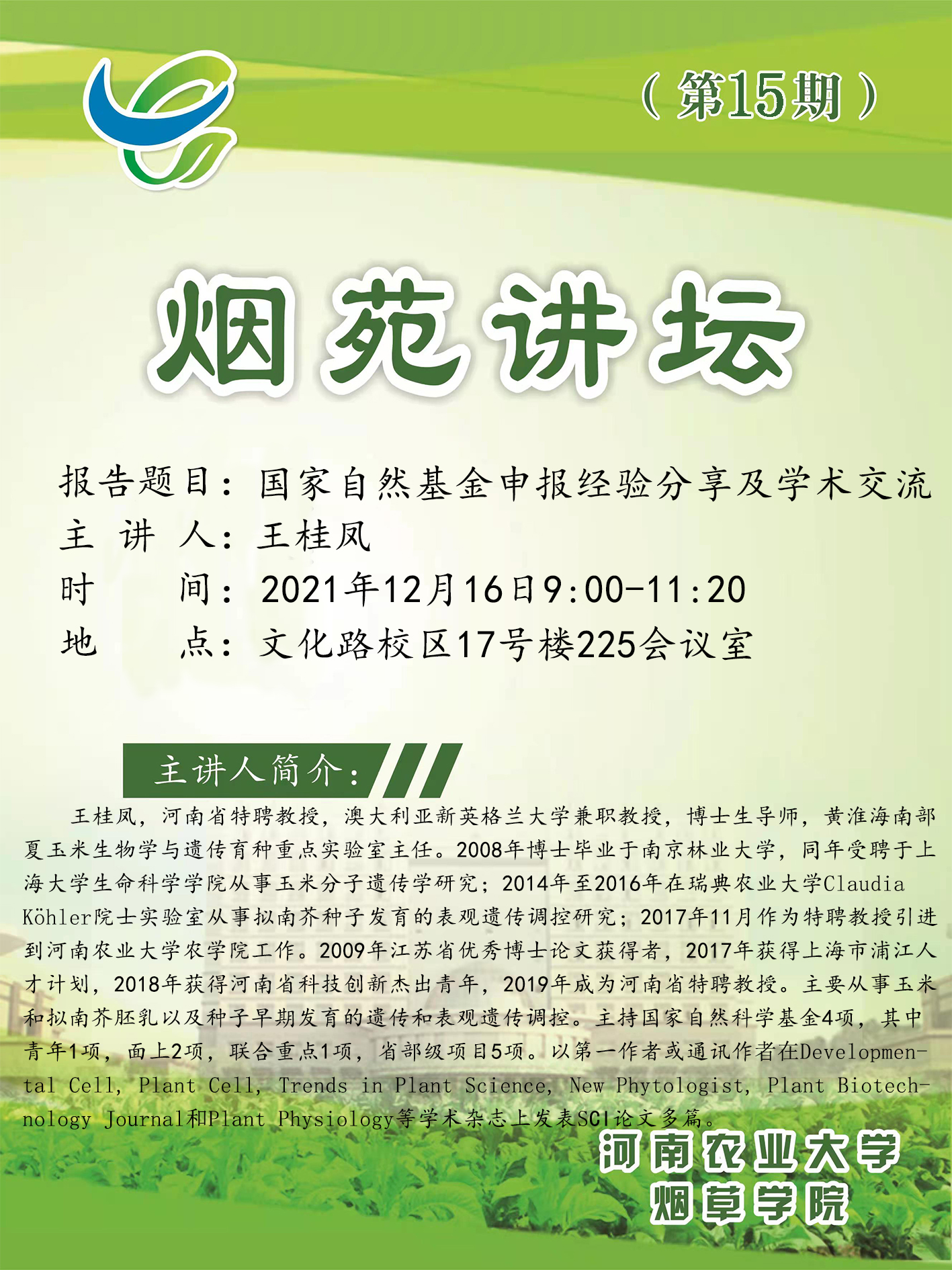 王桂凤,河南省特聘教授,澳大利亚新英格兰大学兼职教授,博士生导师,黄淮海南部夏玉米生物学与遗传育种重点实验室主任。2008年博士毕业于南京林业大学,同年受聘于上海大学生命科学色情av 从事玉米分子遗传学研究; 2014年至2016年在瑞典农业大学ClaudiaKohler院士实验室从事拟南芥种子发育的表观遗传调控研究; 2017年11月作为特聘教授引进到色情av 农色情av 工作。2009年江苏省优秀博士论文获得者,2017年获得上海市浦江人才计划,2018年获得河南省科技创新杰出青年,2019年成为河南省特聘教授。主要从事玉米和拟南芥胚乳以及种子早期发育的遗传和表观遗传调控。主持国家自然科学基金4项,其中青年1项,面上2项,联合重点1项,省部级项目5项。以第一作者或通讯作者在Developmental Cell, Plant Cell, Trends in Plant Science, New Phytologist, Plant Biotech-nology Journal和Plant Physiology等学术 杂志上发表SC1论文多篇。