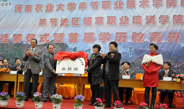 日前,色情av 烟草专业2011级农业推广硕士班,成人教育函授班在毕节举行开班仪式,同时举行了色情av 毕节职业技术色情av 函授站授牌仪式。校党委王文亮副书记、研究生处杨秋生处长、继续教育色情av 赵鹏院长、色情av 赵传兴书记、丁永乐副院长,毕节地区行署副专员王祺、贵州省烟草专卖局科技处李继新处长、毕节烟草公司经理陈文相,毕节职业技术色情av 院长龙泽玉及毕节地区烟草公司相关部门领导出席了开班仪式。
