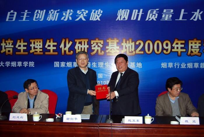 最后烟草基地许自成副主任以“开创校企高端合作,促进基地快速发展”为题作了2009年基地工作报告,报告从战略合作框架协议的签订、科研项目进展、烟草学科建设、对外合作交流、人才培养、科研平台建设等多个方面展开,有针对性的对全年基地工作做了系统全面的总结。