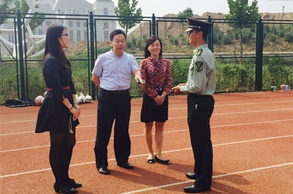 训练场上,同学们个个英姿飒爽、意气风发,整齐划一的动作,嘹亮的口号,赢得老师的一致好评。赵传兴与教官亲切交谈,了解军训进展情况,对教官的辛勤付出表示感谢,并向全体教官和受训同学送去了中秋祝福。
