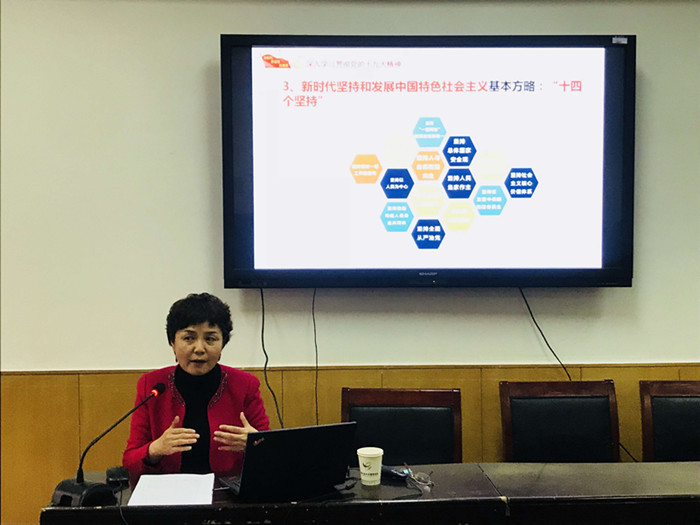 陈娱就十九大报告的主题、主要成果,中国特色社会主义道路、理论体系、制度和文化“四位一体”,新时代中国特色社会主义思想的重大理论创新,新时代中国特色社会主义建设的总依据和总目标等多个方面,对报告传递的重要信息作了梳理。陈娱认为,十九大报告高瞻远瞩、立意深远,主题鲜明、布局清晰,提振人心、激扬斗志,充分展现了党的十八大以来我国取得的新成就。十九大报告提出定位新时代,发展创新新思想,准确把握新矛盾,规划未来新目标,充分体现了中国共产党人特有的历史观、时代观和发展观,明确了决胜全面建成小康社会的重大任务,开启了全面建设社会主义现代化强国新征程,指明了中华民族伟大复兴的前进方向,是中国特色社会主义进入新时代的政治宣言与开篇之作,也是具有重大历史意义和国际影响的马克思主义理论文献与最新成果。