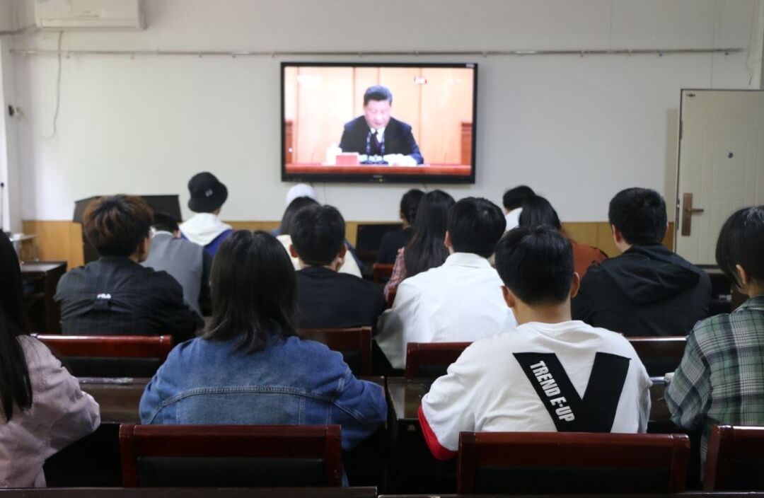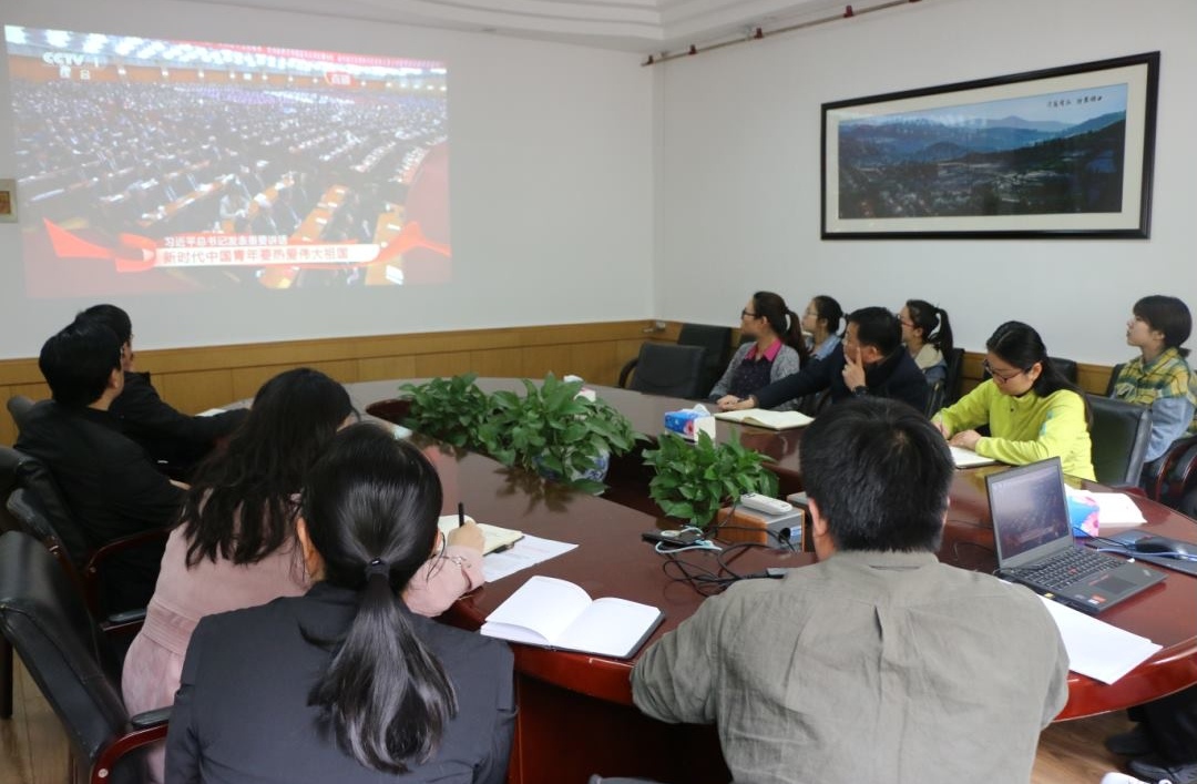 领导班子、师生代表在17号楼208、225会议室集中观看大会直播,认真学习习近平总书记在五四运动100周年大会的讲话精神。