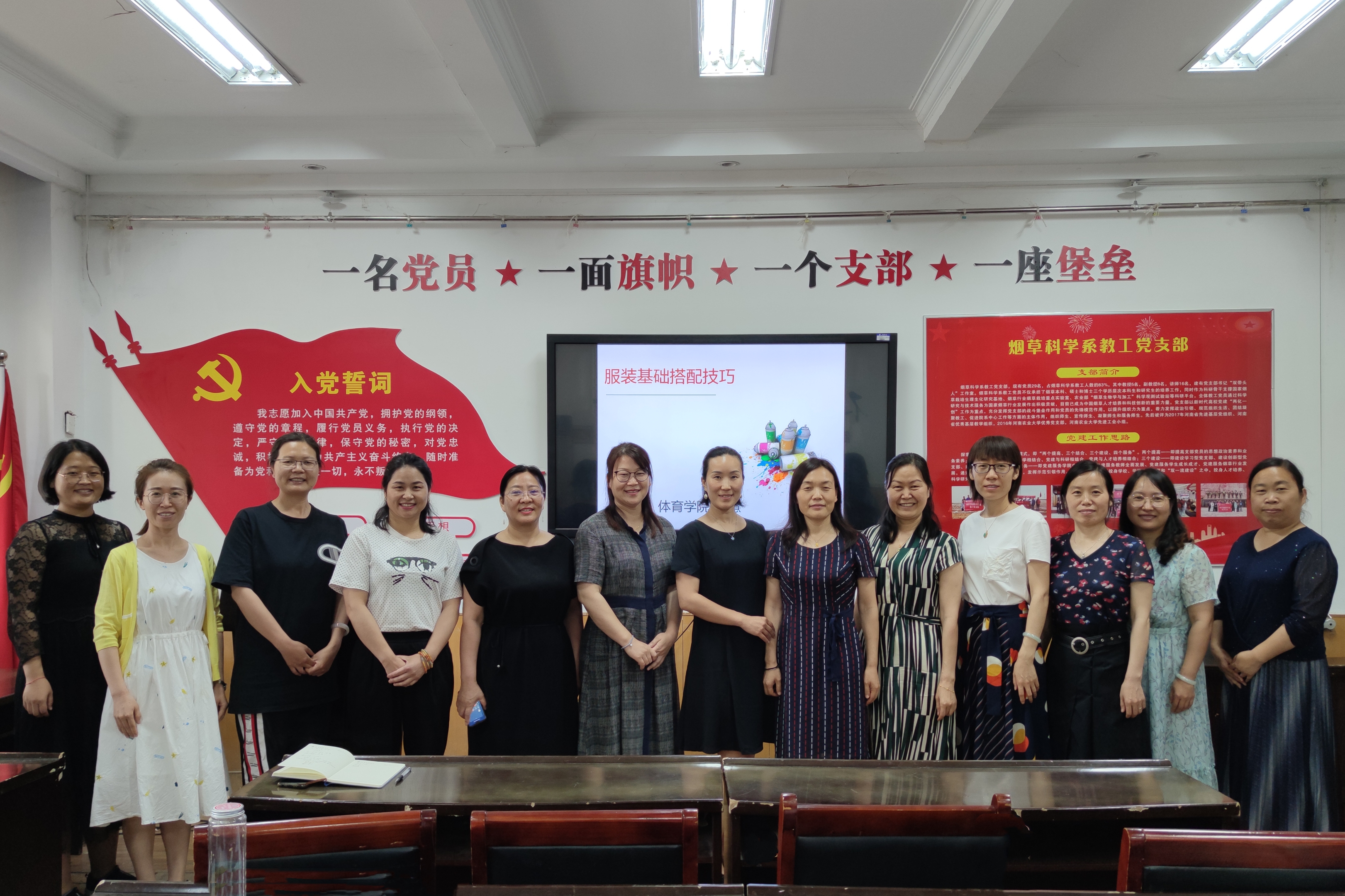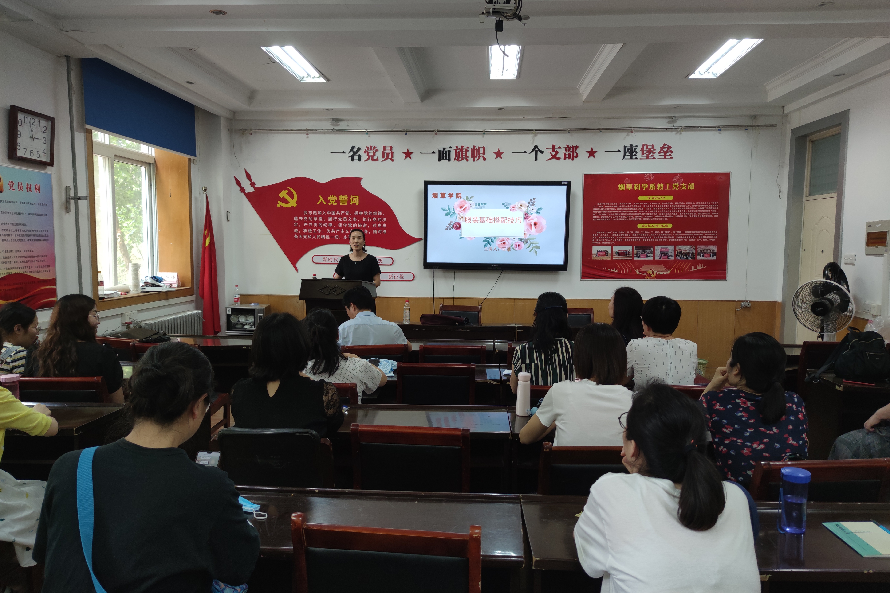 王慧从色彩的三原色开始,详细的讲解了色彩分类解读、颜色语言表达、人与色彩的搭配规律等基础知识,又在现场做示范指导老师们的穿搭方式和化妆技巧。在王慧老师的指导下,各位女教师总结出了适合自己的风格服饰,活动现场气氛温馨融洽,处处洋溢着老师们的欢声笑语。