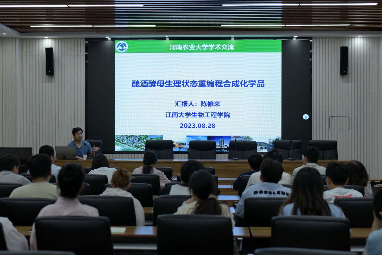 陈修来教授利用酵母细胞活力调控、酵母细胞骨架改造、酵母蛋白相分离等三个研究案例讲解了酿酒酵母生理状态重编程的研究进展及在生物合成化学品中的应用。最后参会师生就生物合成研究技术及生物合成香料等相关问题进行了深入交流。