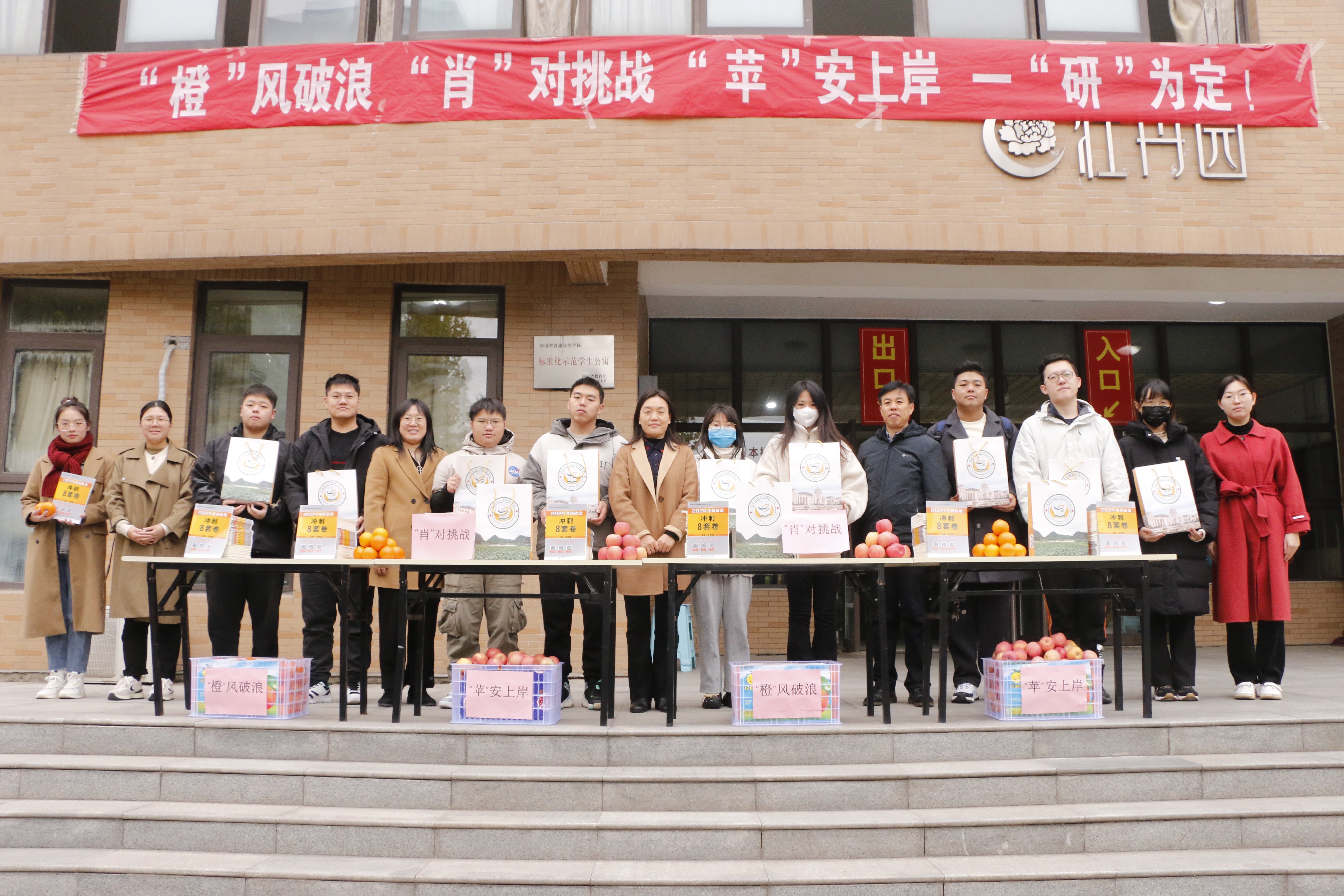 寒冬已至,备战已久的考研学子迎来了紧张的冲刺阶段。为鼓舞考研士气,减轻同学们的焦虑,增强大家考研的信心。11月10日,色情av 在龙子湖校区牡丹园门口开展“‘橙’风破浪 ‘肖’对挑战 ‘苹’安上岸 一‘研’为定”冬季送温暖活动,为2024届考研学生送上冬日最温暖的祝福。色情av 党委书记张利冰、党委副书记史军伟及全体辅导员老师出席活动,色情av 2024届学生代表参加活动。