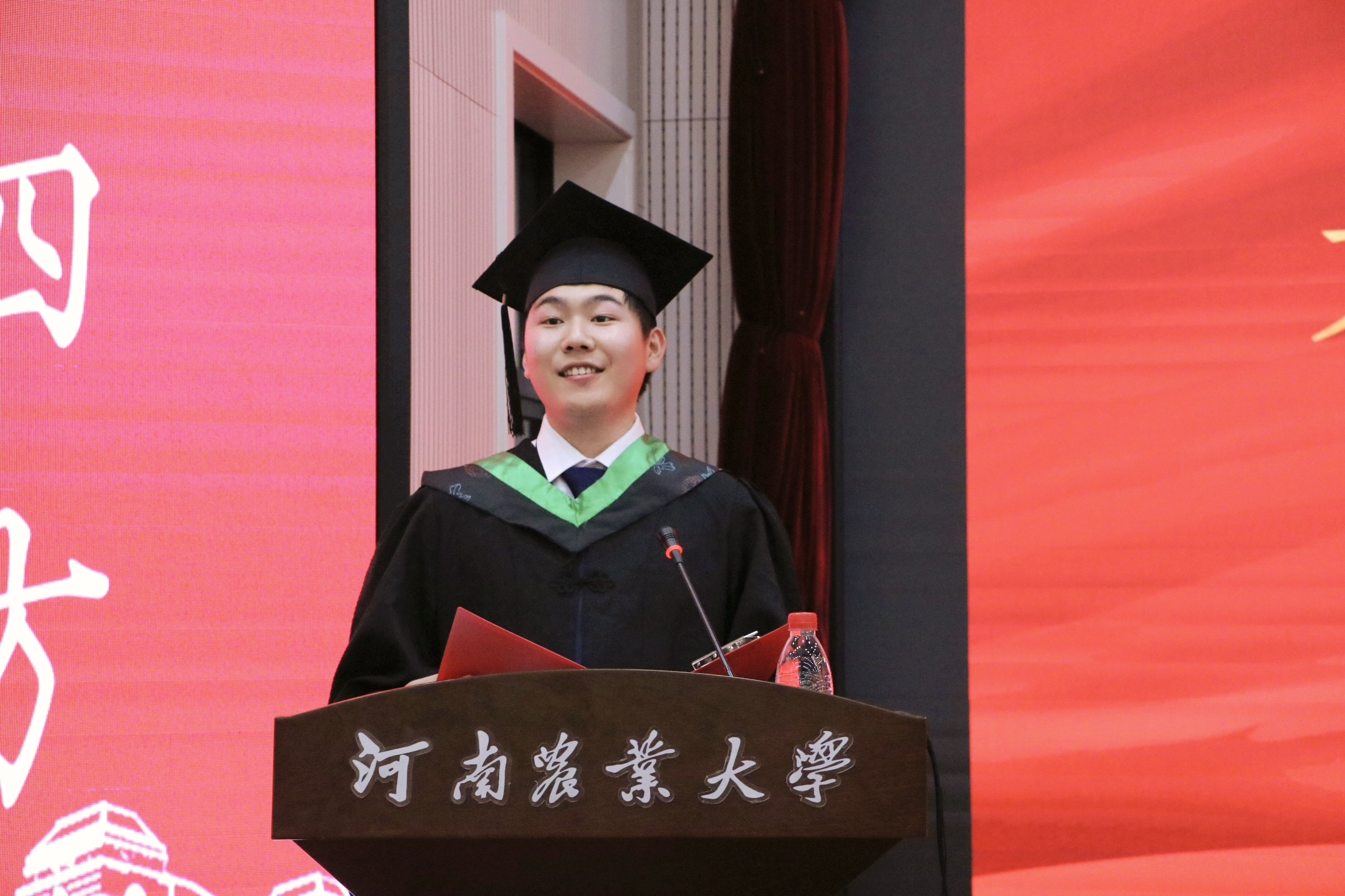 烟草工程系教师、21级烟工4班班主任付博作为教师代表发言,他勉励毕业生们在未来的旅途中始终秉持学习不辍、心存善意、坚韧笃定、家国在心的精神风貌,勇敢追逐梦想,一步一个脚印,行稳致远,书写属于自己的精彩人生。