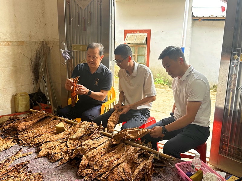 调研团队深入雪茄烟叶生产一线,在德保县走访烟农,亲切交流了解种植情况,细致查看烟叶晾制情况;实地考察了德保那美雪茄种植基地的烟田选址规划,并走进现代化晾房群,重点查看了设施设备配套与运行情况。在靖西市,时向东一行前往百色烟草靖西营销部,实地观摩雪茄烟叶收购流程,深入了解发酵工艺关键环节;随后走访靖西隆江雪茄产业园,现场查看本年度雪茄烟叶的晾制进展与品质。