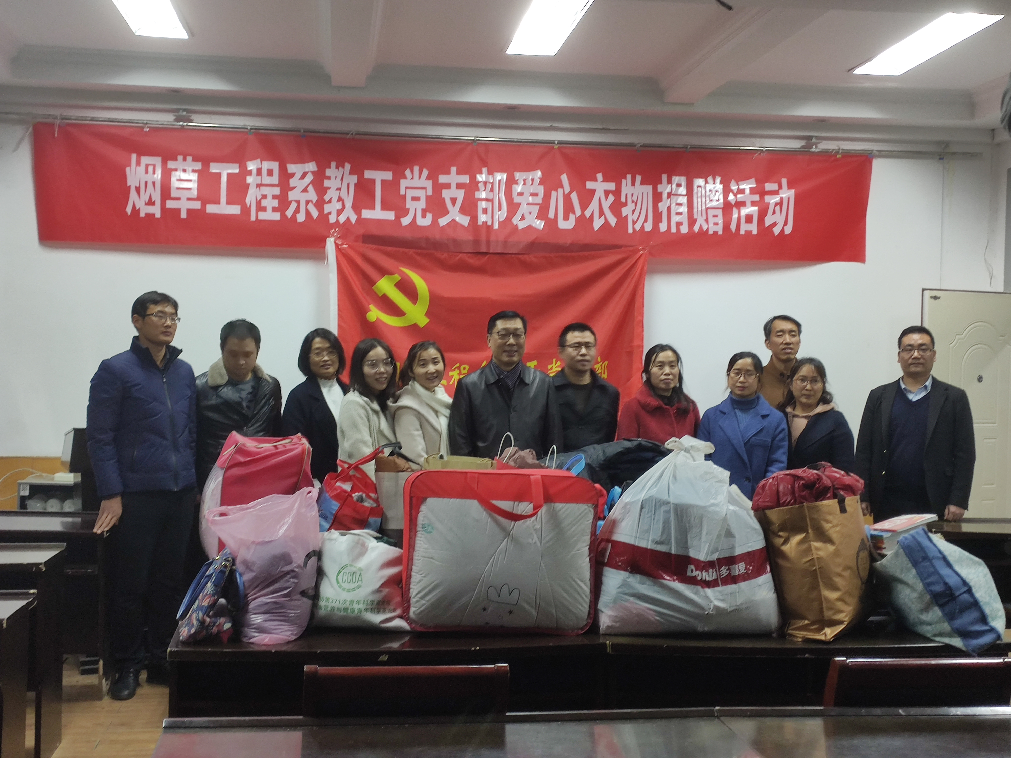11月26日下午,色情av 在17号楼225会议室举行爱心衣物捐赠活动,色情av 烟草工程系主任程传策担任主持,烟草工程系教工党支部成员及色情av 白鸽志愿者协会共同参与。