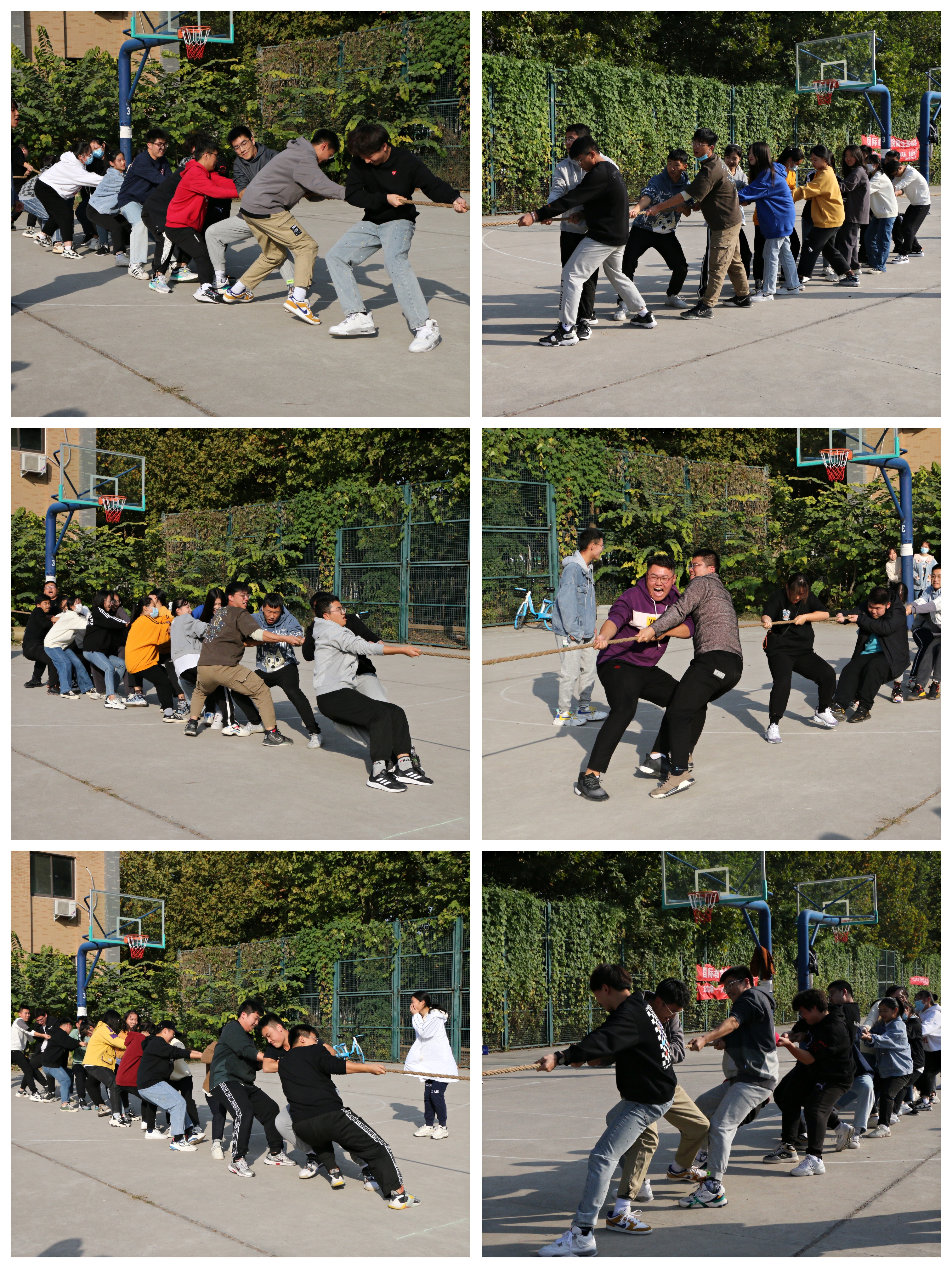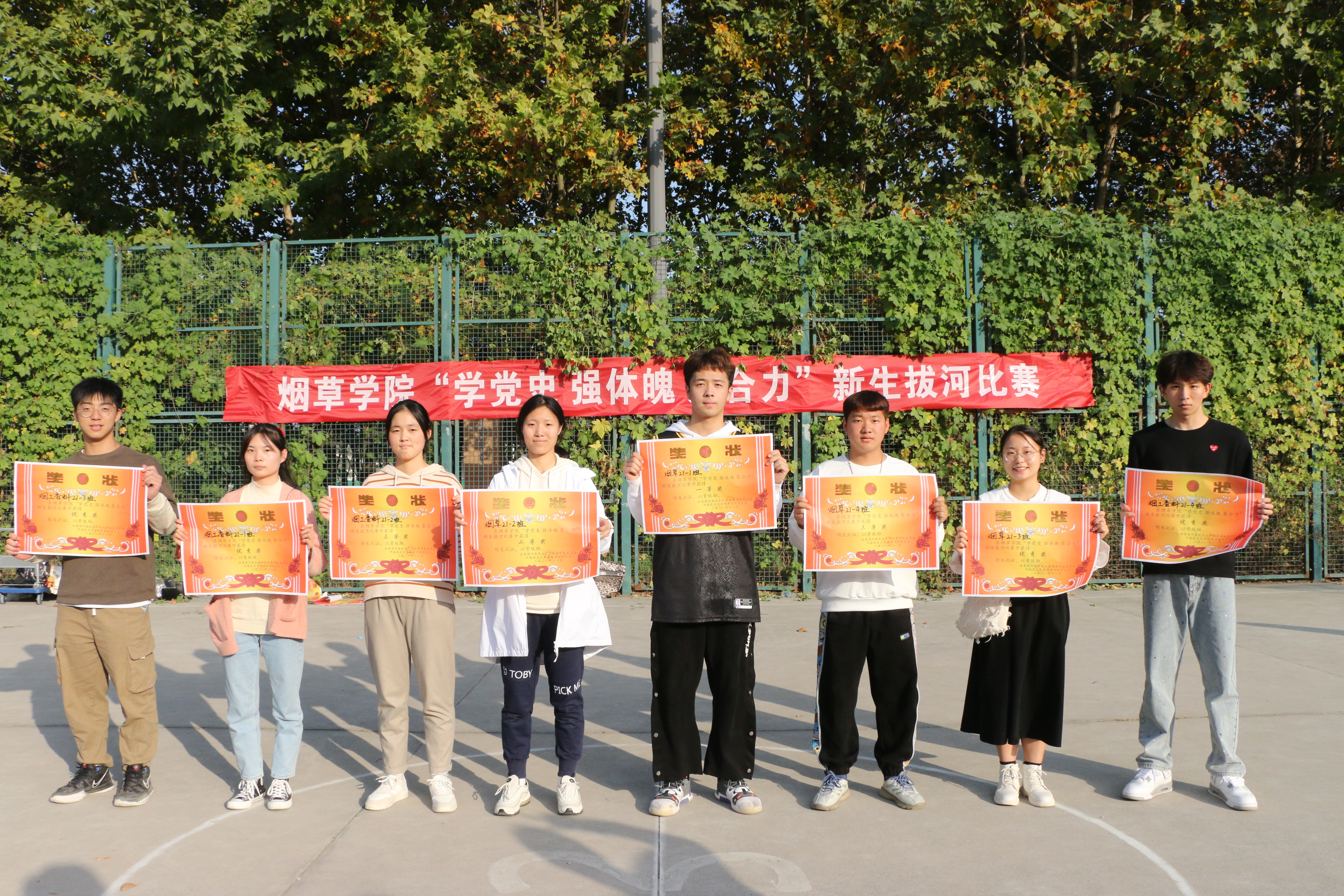 比赛分淘汰赛、半决赛和决赛三个赛程,采用三局两胜制。随着一声哨响,拔河比赛正式开始,参赛选手都以极大的热情投入到这场比赛当中,大家拧成一股绳,心往一处使,都铆足了劲,脚下似有千钧力拔,斗志昂扬,顽强拼搏。选手们的嘶吼声、啦啦队员助威呐喊声,此起彼伏,声浪阵阵,推动着现场气氛走向高潮。经过激烈的角逐,烟草21-1班荣获一等奖,烟草21-2班获得二等奖,烟工香料21-2班、烟草21-4班获得三等奖,烟工香料21-1班、烟工香料21-3班、烟草21-3班、烟草21-4班获得优秀奖。
