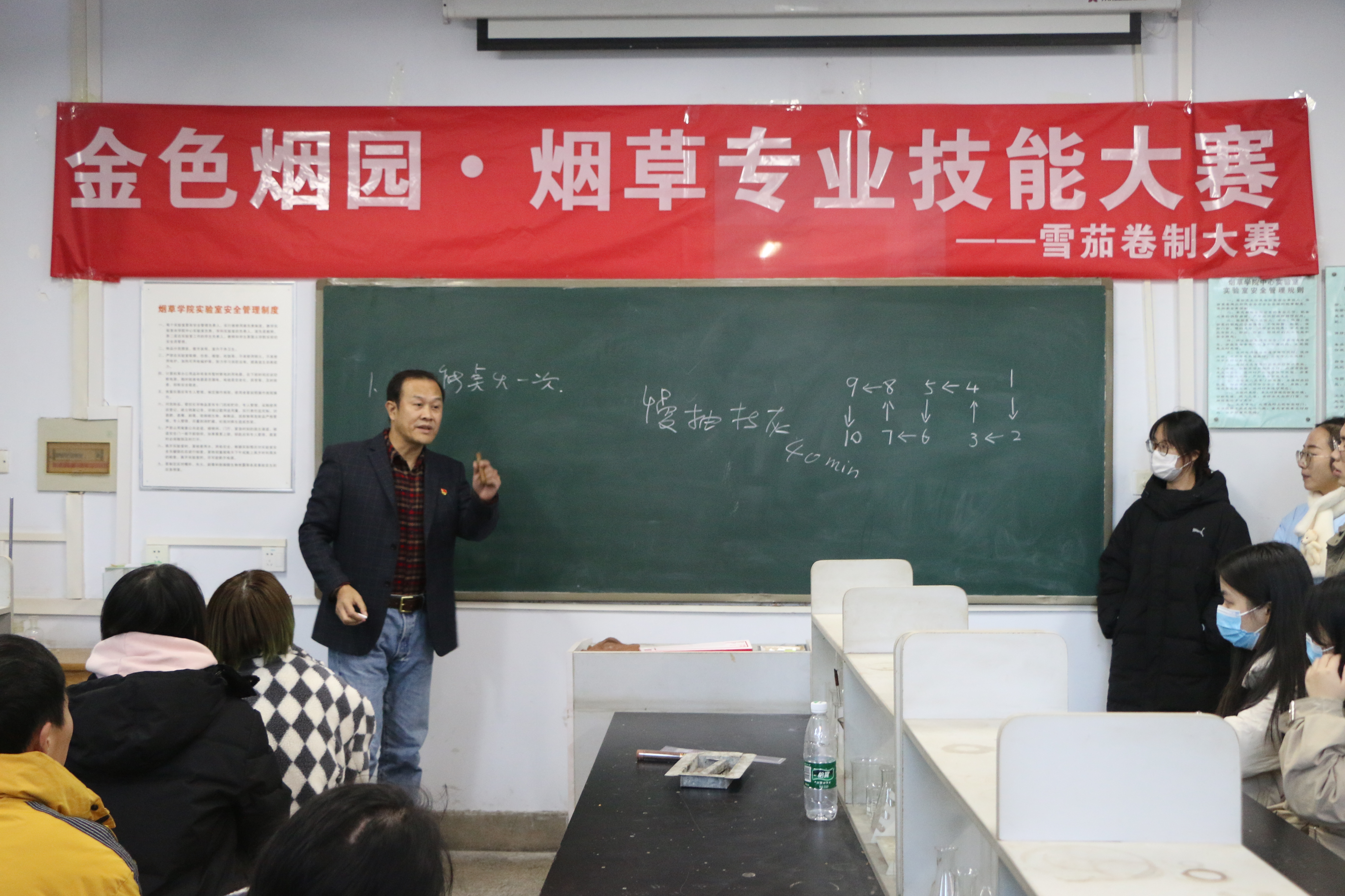 本次活动共有20支代表队参赛。赛前,时向东教授向参赛学生讲解了雪茄文化和雪茄卷制的注意事项,并用熟练的技巧以及精湛的操作为同学们演示了雪茄的卷制。比赛中,各支代表队按照雪茄卷制流程分工协作、配合默契,均完成了雪茄卷制的全过程。期间,时向东教授和雪茄实验室学生在现场对基础较为薄弱的参赛队员进行了耐心的指导和示范。随后,雪茄持灰技能比赛和烟叶分级比赛分别在17号楼121实验室和225会议室进行。