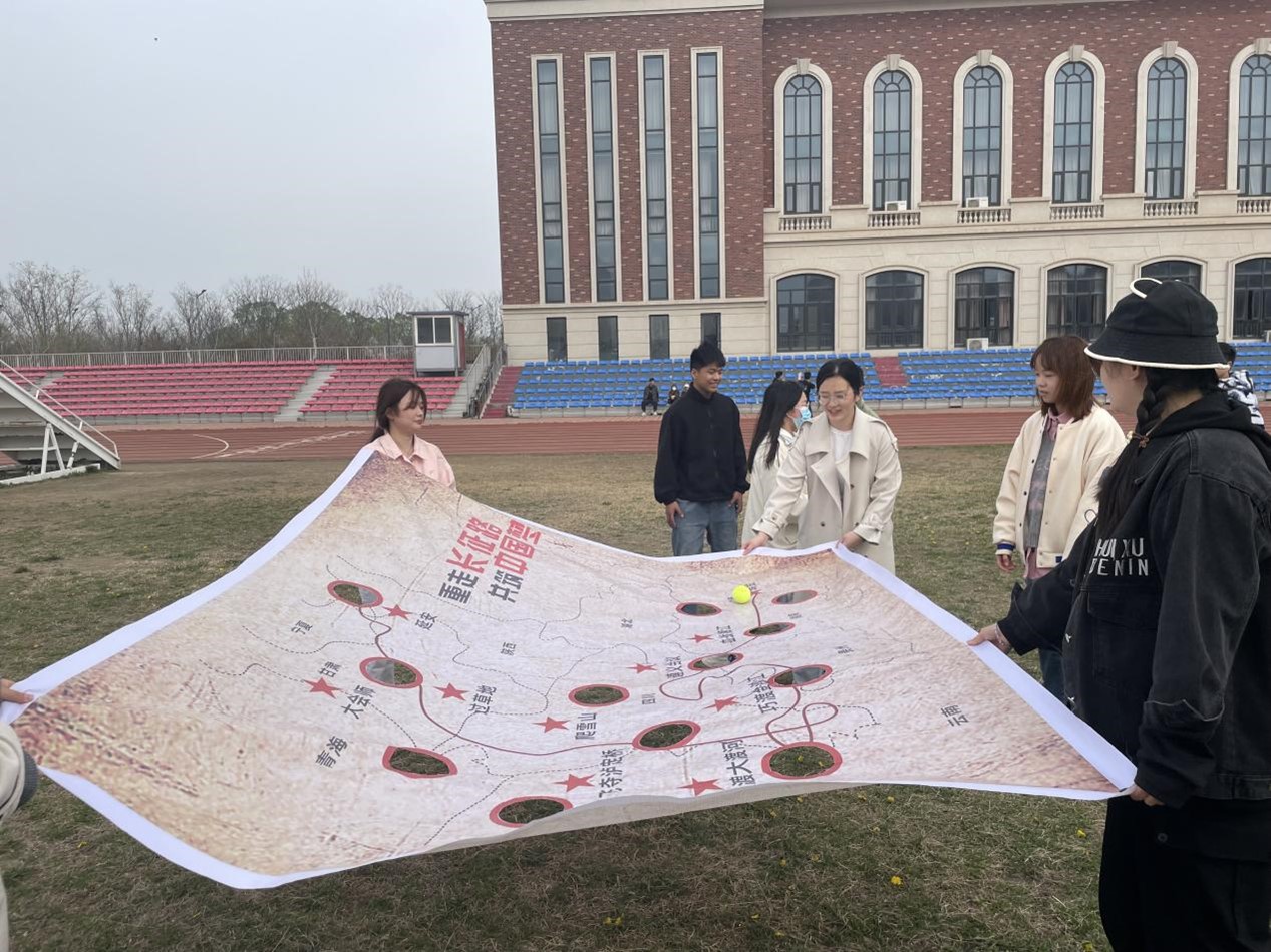其次,我们进行了重走长征路游戏,用网球从江西瑞金出发,按长征路线图依次经过长征重要事件发生区域,最后抵达陕西延安即挑战成功,小组成员需要互相配合、集中注意力才能以最短的时间完成。