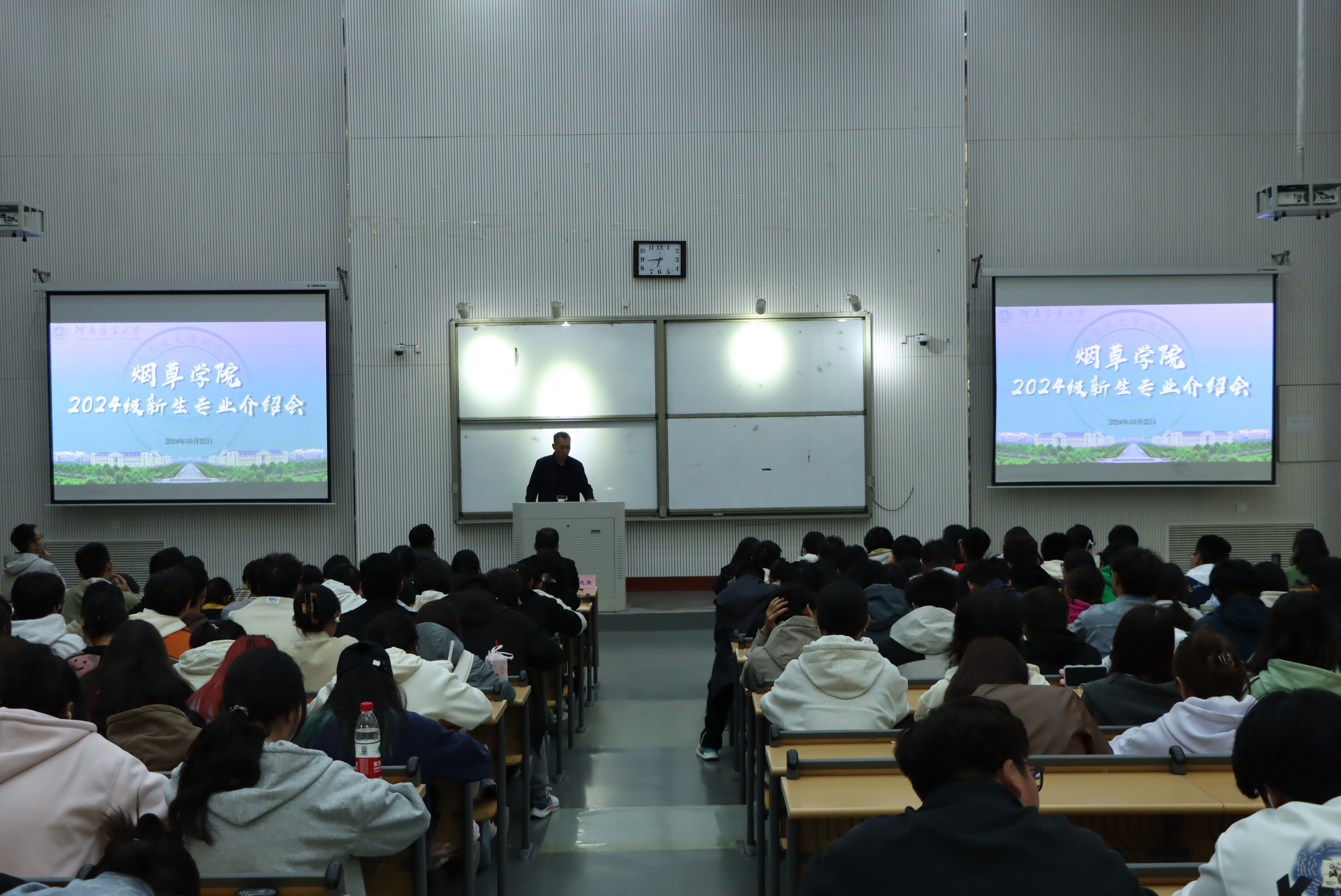 于龙子湖校区繁塔楼CD间大教室五召开2024级新生专业介绍会。烟草科学系系主任黄五星、烟草工程系系主任田斌强、香料技术与工程系系主任武志勇及2024级全体新生参加会议。会议由辅导员昌堃主持。