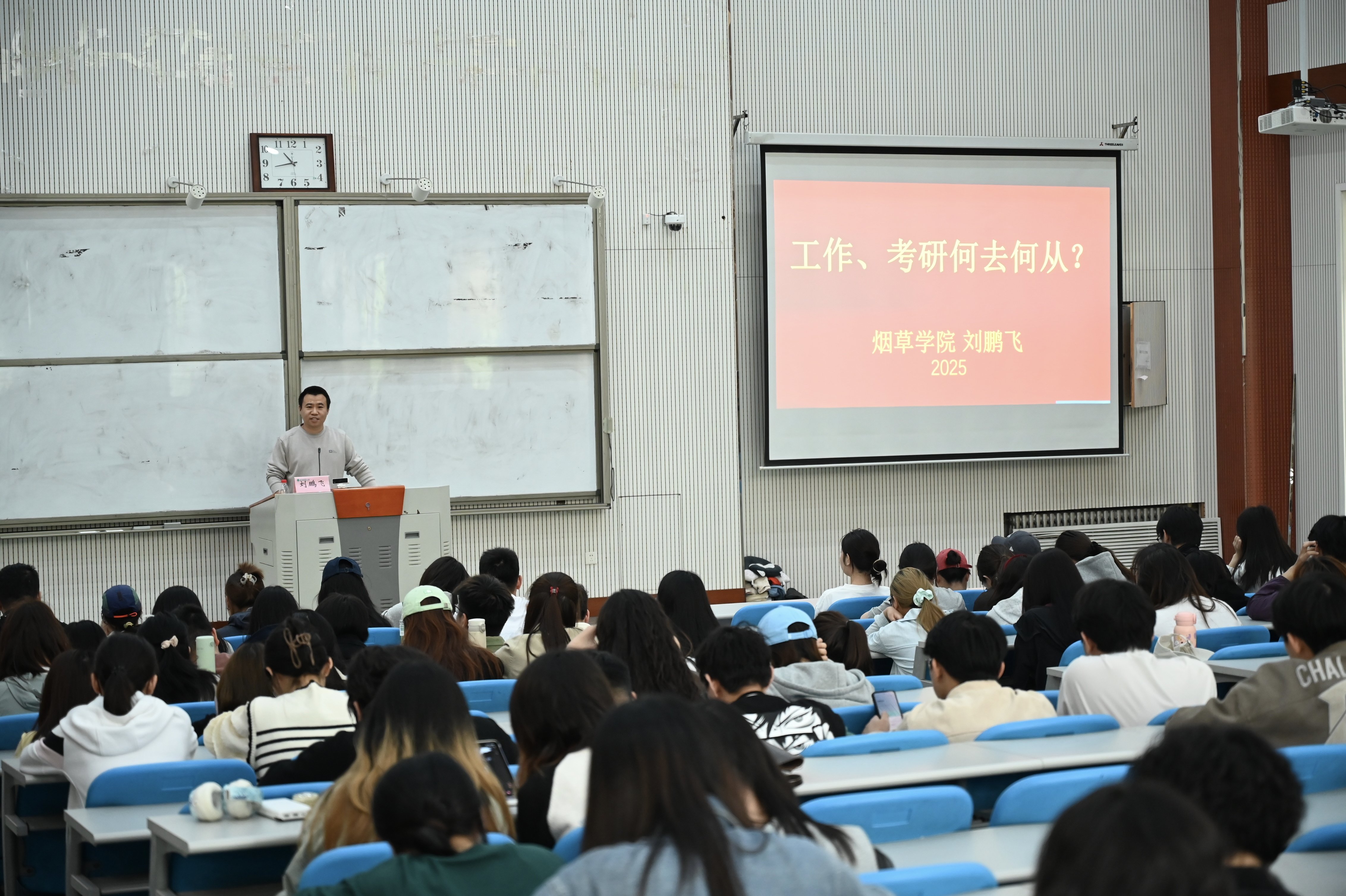 历年来升学就业趋势,分别从职业生涯规划、就业方向指导和考研备考策略等三个方面进行了具体详细的讲解。他脉络清晰地梳理了烟草行业中工业、商业的岗位类别和性质差异,为学生进行人职匹配和报考准备打下基础。此外,刘鹏飞精准分析了近年来考研报考趋势,悉数罗列烟草及相关专业院校和科研院所的招生情况,倡导学生要尽早确立考研目标,理清优先次序。学生纷纷表示:刘老师的报告“干货满满”,有效化解了考研就业准备期的迷茫和焦虑。